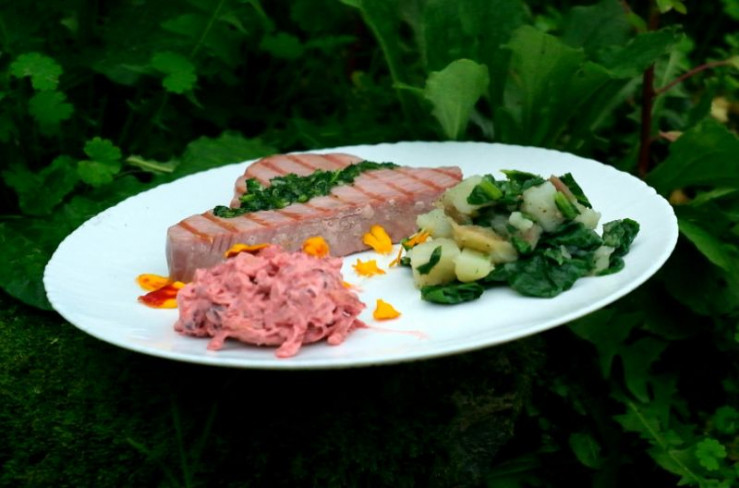 Das Thunfischsteak aus Montenegro wird in dicke Scheiben geschnitten, in Olivenöl und Petersilie mariniert und dann auf heißer Glut gebraten. Dazu passt ein Rote-Bete-Salat.