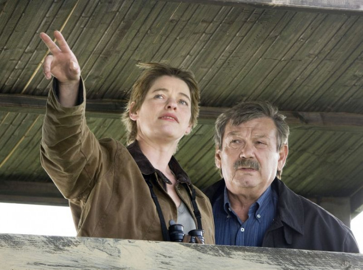 Schneider (Wolfgang Winkler) lässt sich von einer Jägerin (Bettina Kurth) auf dem Hochstand zeigen, wo sie die Lichtkegel der Fahrzeuge in der Unfallnacht gesehen hat.