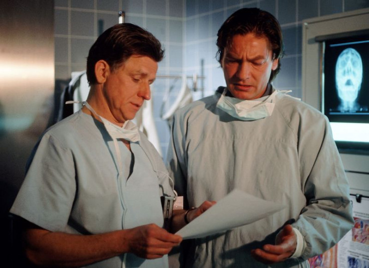 Dr. Mahringer (Ulrich Anschütz) spricht mit Dr. Lüdwitz (Rainer Grenkowitz, re.) über die Überlebenschancen von Dr. Gabriele Kollmann. +++ Die Verwendung des sendungsbezogenen Materials ist nur mit dem Hinweis und Verlinkung auf RTL+ gestattet. +++