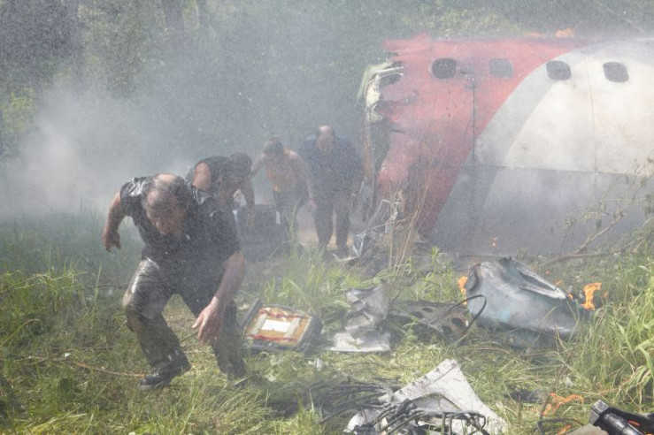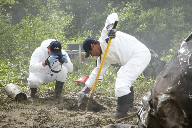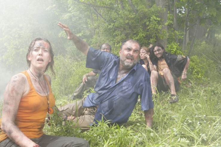 Survivor Hector Ugarte (played by Joe Rafla) points a female survivor in the direction of safety moments after Tans Peru Flight 204 crashes during a violent hailstorm in Pucallpa, Peru. Even though they've crashed only 4 kilometers from the runway, survivors must wait nearly 30 minutes for rescuers to make their way through the thick woods to reach them.