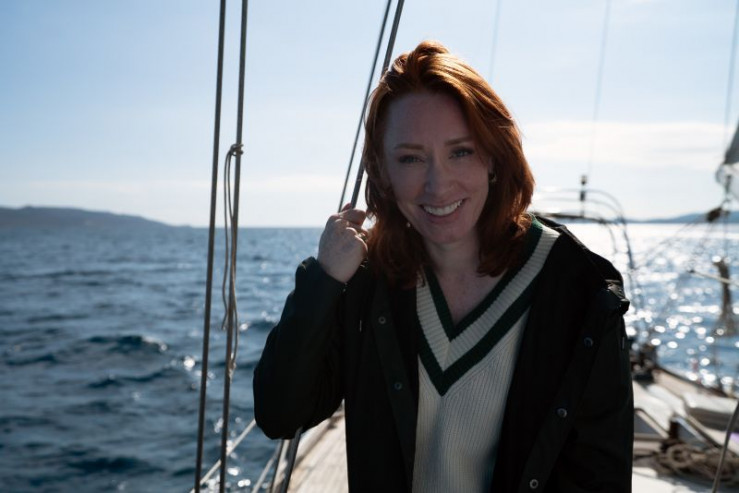 Hannah Fry on a boat with a contributor.