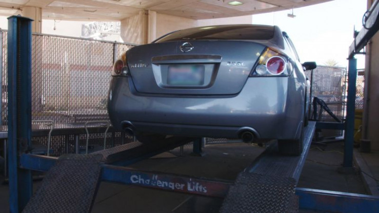 A suspect's vehicle is lifted in order for CBP officers to inspect the underside