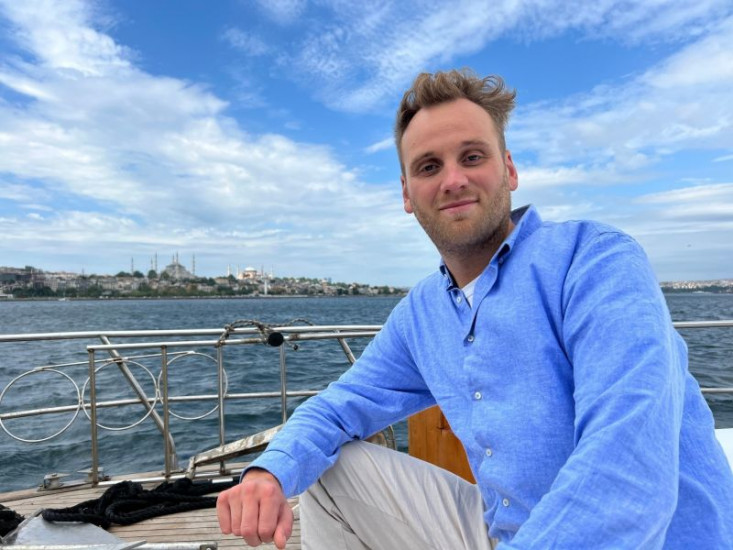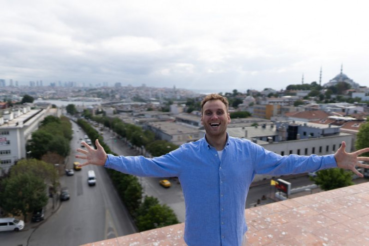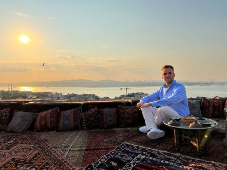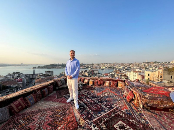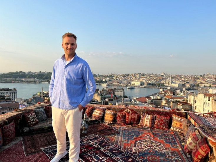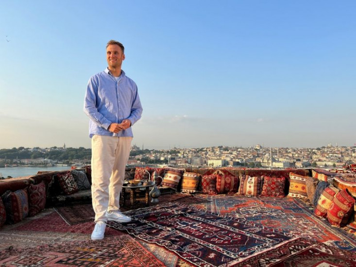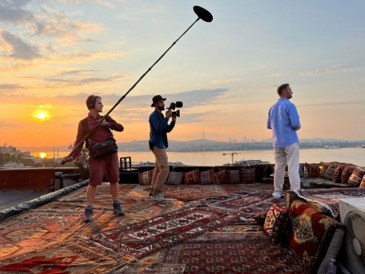 Blaue Stunde in Istanbul. Leon Windscheid bei Dreharbeiten mit Blick auf den Bosporus. Auf der anderen Seite das goldene Horn mit der Altstadt.