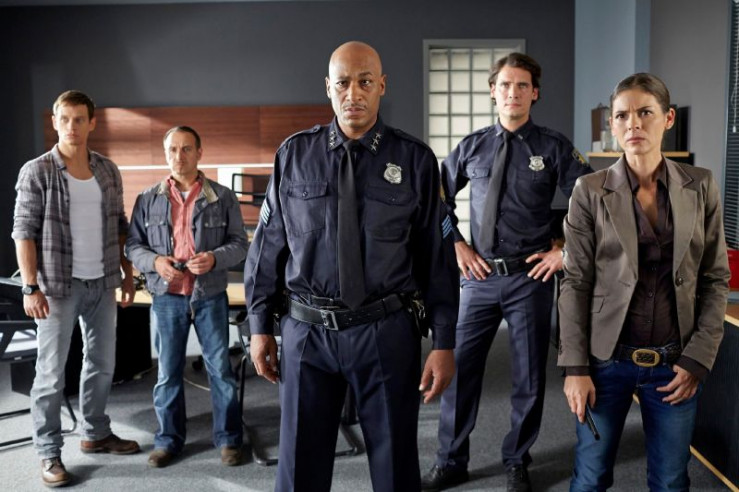 Patrick O'Connor (Paul Grasshoff, 2.v.l.) gibt Sam (Steve Windolf, l.) vor (v.r.) Kim Krüger (Katja Woywood), Semir (Erdogan Atalay), Alex (Vinzenz Kiefer) und Hillerman (Terence Maynard) die Schuld an Jessies Entführung.