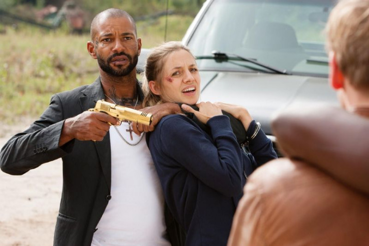 Ricardo Cortez (Tyron Ricketts) droht Jessie (Annika Blendl) zu erschießen, sollte er sein Geld nicht bekommen...