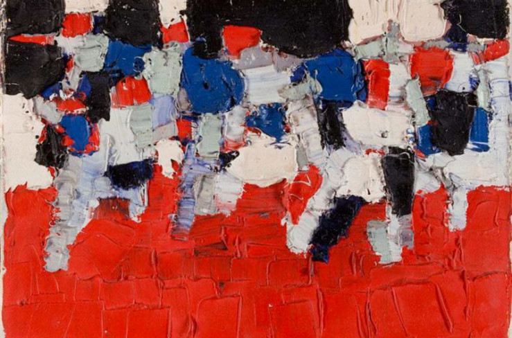 In seinem Gemälde aus der Serie "Les Footballeurs" (1952) stellt Nicolas de Staël die Verteidigung im Fußballspiel mit Farben, Rhythmus und Komposition dar.