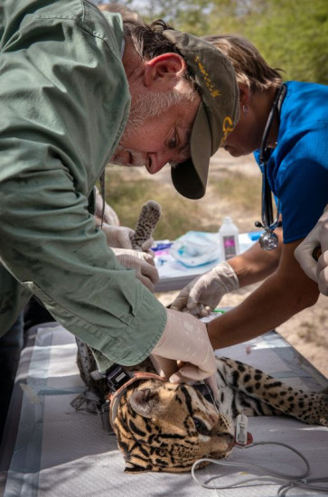 Wildkatzenforscher Michael E. Tewes bringt ein GPS-Halsband an einem Ozelot an, der für Forschungszwecke gefangen und sediert wurde. Das Halsband wird den Biologen Bewegungs- und Aktivitätsdaten der Katze liefern.