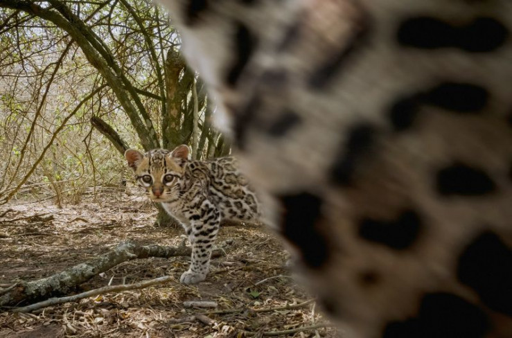 Ein junger Ozelot linst hinter seiner Mutter hervor. Mit weniger als 120 bekannten Ozelots in Texas, USA, ist dieses Kätzchen umso wertvoller für den Fortbestand der Art.