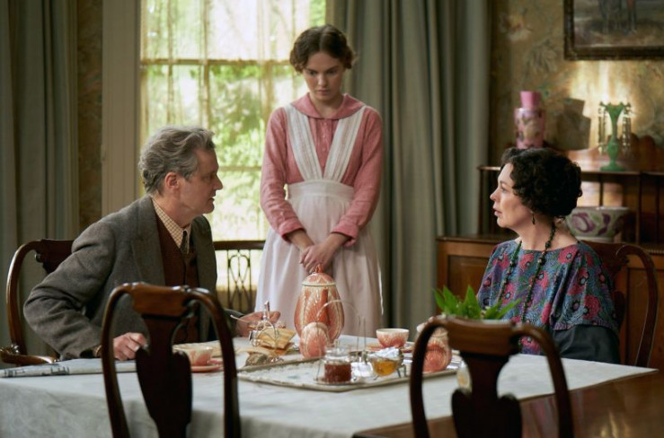 Jane Fairchild (Odessa Young, Mi.) arbeitet als Hausmädchen bei Godfrey Niven (Colin Firth, li.) und seiner Gattin Clarrie (Olivia Colman, re.).