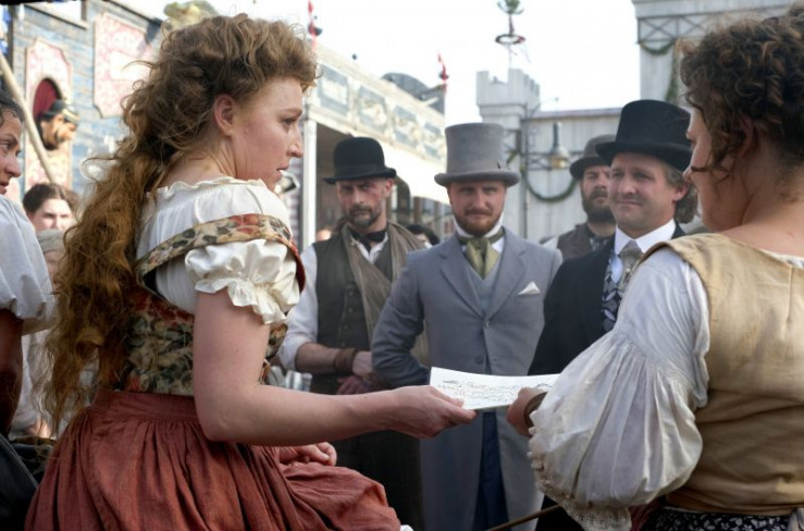 Von links: Colina Kandl (Brigitte Hobmeier) verhandelt mit Stadtrat Alfons Urban (Michael Kranz, Mitte mit grauem Zylinder) und dem Vorstandsvorsitzenden der Capital Bräu AG, Anatol Stifter (Maximilian Brückner, rechts neben Urban), über die Bierpreiserhöhung.