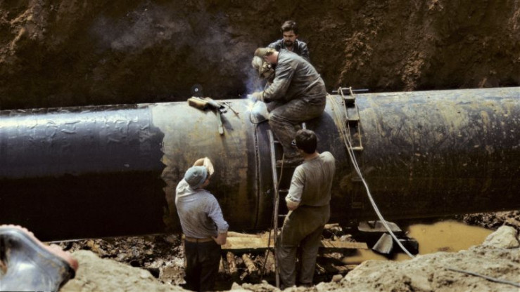 Arbeiter bei Schweißarbeiten an der "Drushba"-Trasse, 1970er, Ukraine