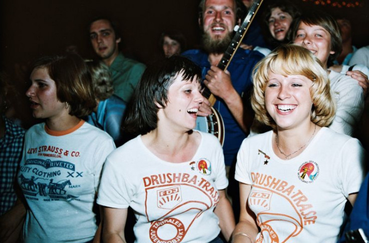 Arbeiterinnen mit "Drushba-Trasse"-T-Shirts beim Feiern, 1970er, Ukraine
