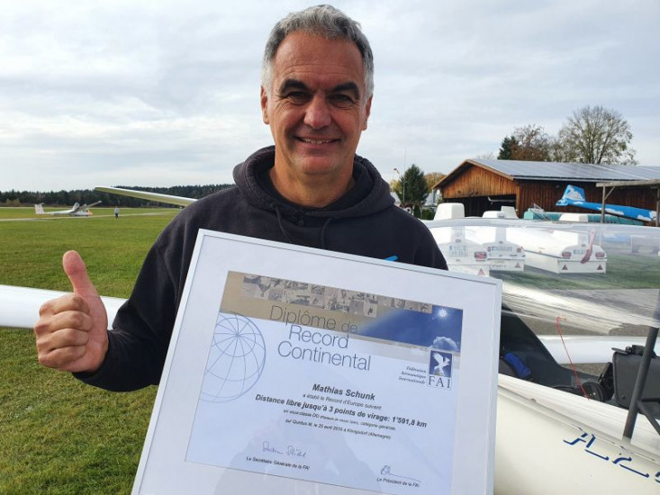 Pilot Mathias Schunk mit seiner Rekordurkunde.