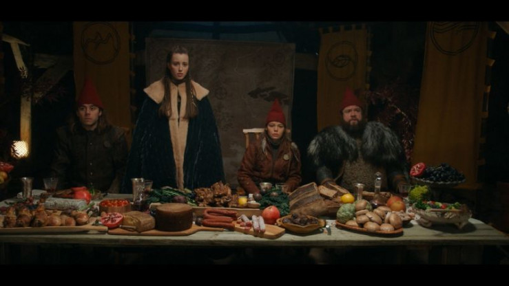 Die vier Königskandidaten Grot (Esben Dalgaard Andersen), Birk (Jakob Femerling), Falke (Viilbjßrk Malling Agger) und Tinka (Josephine Chavarria Hßjbjerg).