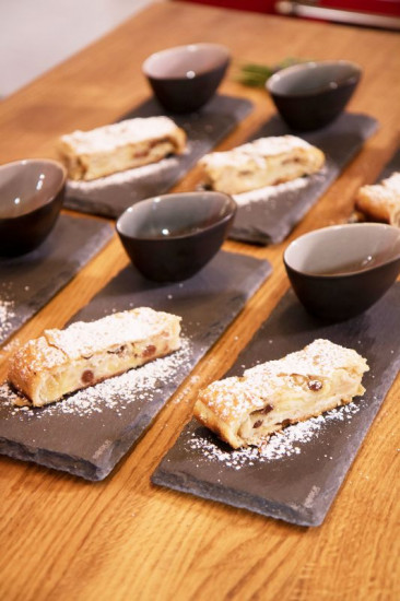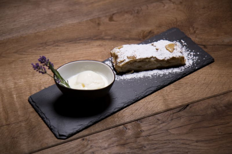 Die Nachspeise: Apfelstrudel mit Lavendeleis.