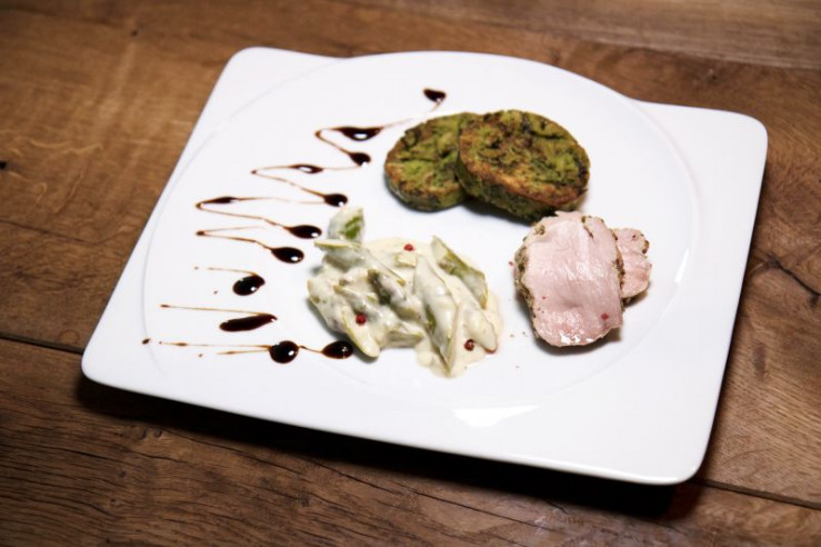 Die Hauptspeise: Schweinefilet in Pfeffer-Senfkruste mit Spinatknödel und Spargel.