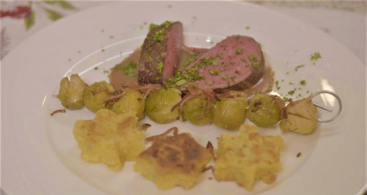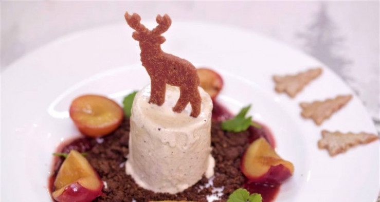 Brigitte stellt für ihr "Landfrauenküche"-Weihnachtsmenü "Heimisches Wild" zusammen und serviert als Vorspeise geräuchertes Wild mit eigenen Kräutern, dazu Birne und schwarze Walnüsse. Als Hauptspeise serviert sie Rehbäckchen auf Rosenkohl und Kartoffelplätzchen. Ein typisches Schwarzwälder Tannenhonig-Parfait mit Schlehen-Quittenmus krönt ihr weihnachtliches Menü.