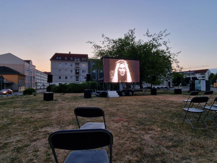 Der im Krieg völlig zerstörte Marktplatz von Demmin wird durch eine Kunstaktion symbolisch mit Leben erfüllt. Die Kleinstadt im Osten von Mecklenburg Vorpommern, wurde am Ende des 2. Weltkriegs von Kriegsgräueln heimgesucht. Der dort stattgefundene Massensuizid gilt als einer der größten in der deutschen Geschichte und führte zu einem kollektiven Trauma. Im Bild: Uraufführung.
