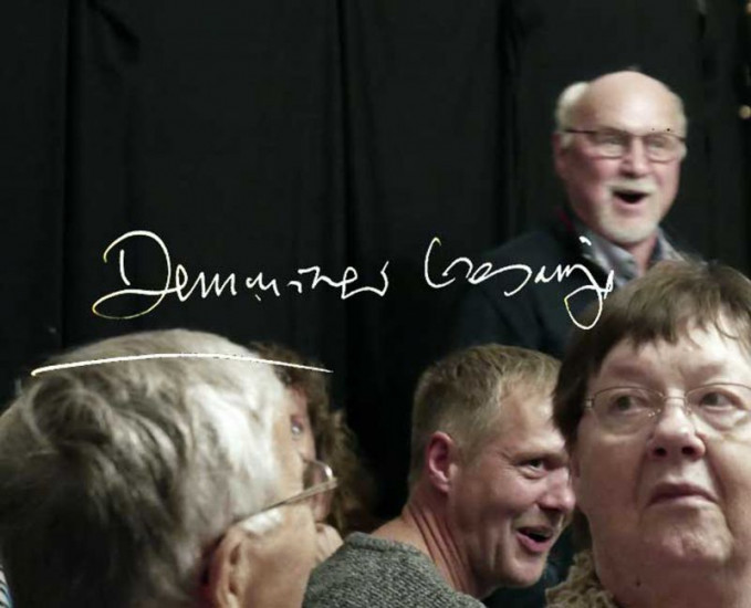 Der im Krieg völlig zerstörte Marktplatz von Demmin wird durch eine Kunstaktion symbolisch mit Leben erfüllt. Die Kleinstadt im Osten von Mecklenburg Vorpommern, wurde am Ende des 2. Weltkriegs von Kriegsgräueln heimgesucht. Der dort stattgefundene Massensuizid gilt als einer der größten in der deutschen Geschichte und führte zu einem kollektiven Trauma. Im Bild: singende Teilnehmer.