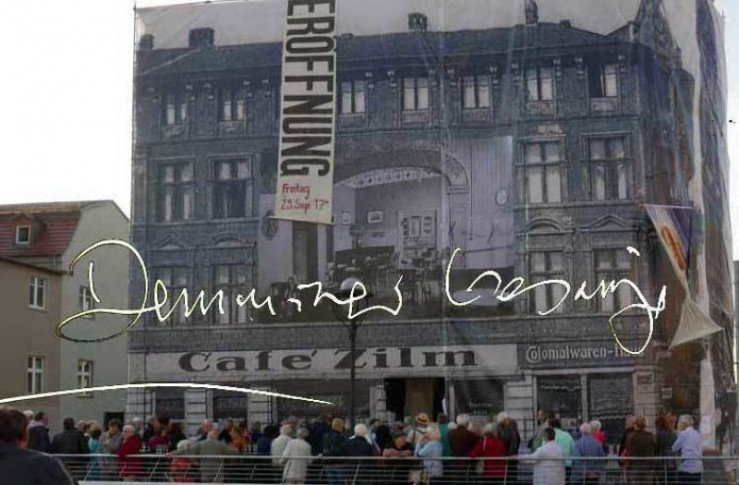 Der im Krieg völlig zerstörte Marktplatz von Demmin wird durch eine Kunstaktion symbolisch mit Leben erfüllt. Die Kleinstadt im Osten von Mecklenburg Vorpommern, wurde am Ende des 2. Weltkriegs von Kriegsgräueln heimgesucht. Der dort stattgefundene Massensuizid gilt als einer der größten in der deutschen Geschichte und führte zu einem kollektiven Trauma. Im Bild: Prospekt Café Zilm.