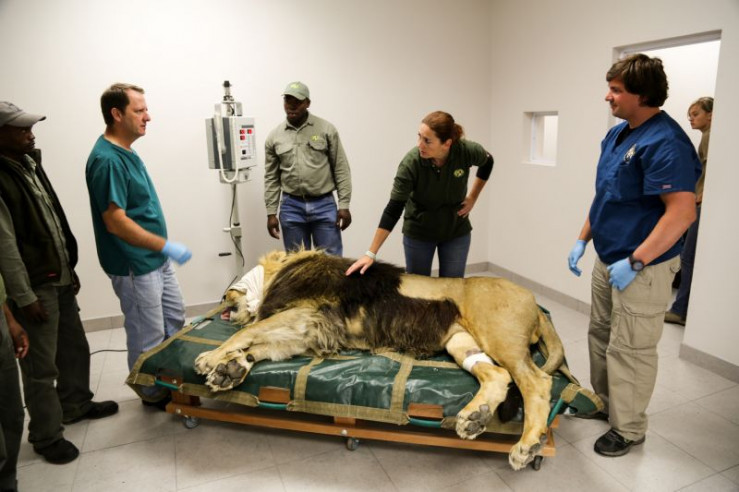 Der riesige Löwe 'Kongo' in Narkose bei einer Röntgenuntersuchung im Veterinärzentrum von Lionsrock. - Tierarzt Gerhard Steenkamp (2.v.l.) und Chef-Tierpflegerin Hildegard Pirker (Bildmitte).