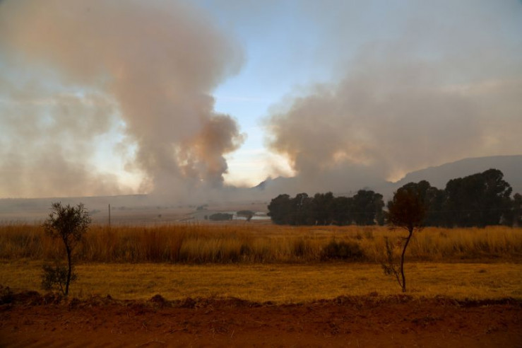 Brennende Savanne am Fuß des Lionsrocks; Buschfeuer sind die größte Gefahr für die Tiere in den Gehegen.