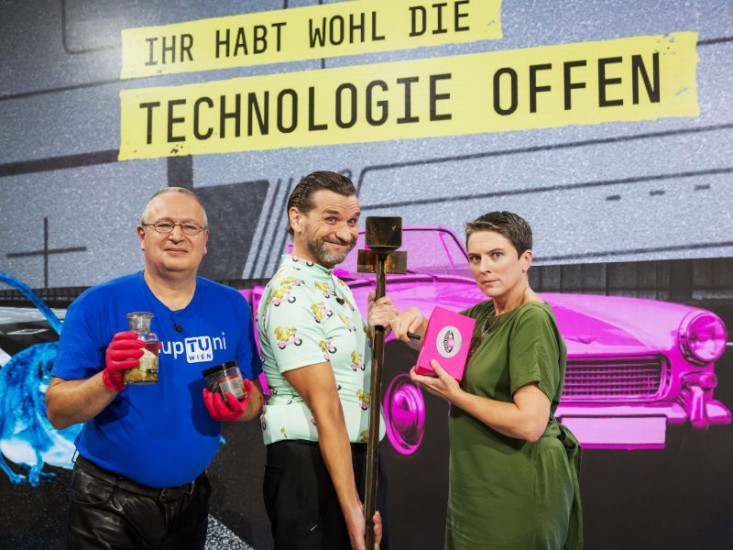 An der Seite von Kabarettist Martin Puntigam beantworten Dr. Elisabeth Oberzaucher (Verhaltensbiologie, Uni Wien) und Associate Professor Peter Weinberger (Chemie, TU-Wien): Wie gut brennen E-Autos? Wie besiegt man Igel?