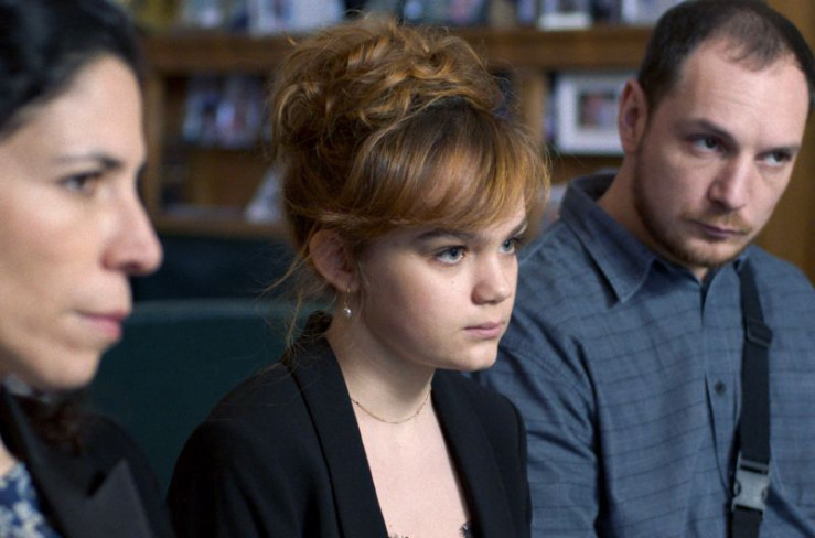 Begleitet von der Kinderanwältin (Yasmina Maïza, li.) und ihrem Erzieher Jayden (Alexis Manenti, re.) beharrt Dalva (Zelda Samson, Mi.) vor dem Richter auf der Unschuld ihres Vaters.