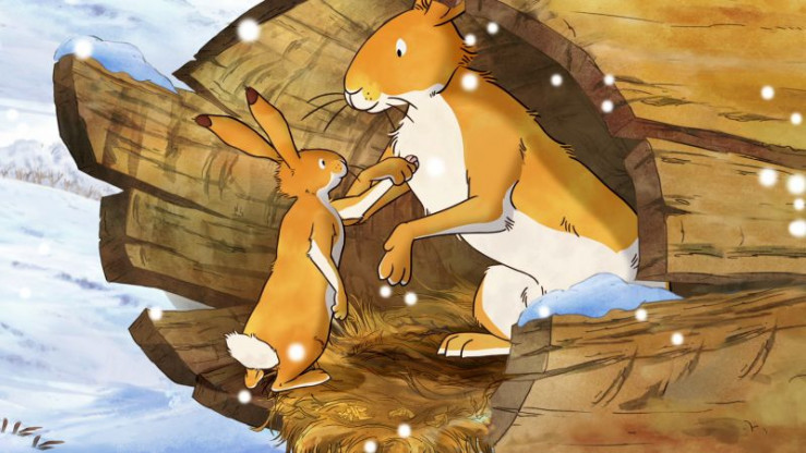 Der kleine braune Hase wundert sich, dass er gar nicht friert. Der große braune Hase erklärt ihm, dass dies an seinem dichten Winterfell liegt.