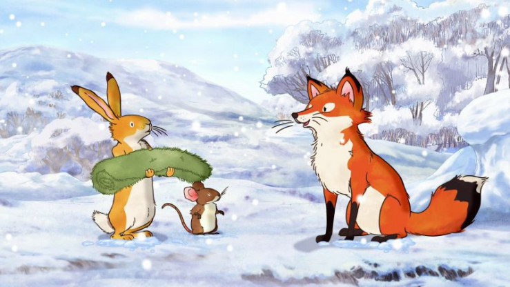 Die kleine Feldmaus und der kleine braune Hase treffen bei ihrem Winterspeziergang auf die kleine Rotfüchsin.