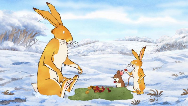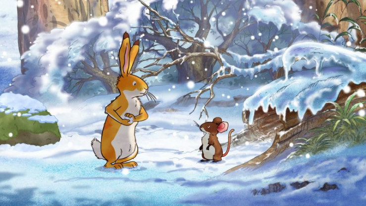 Der kleine braune Hase besucht seine Freundin die kleine Feldmaus, um ihr sein tolles Winterfell zu zeigen.