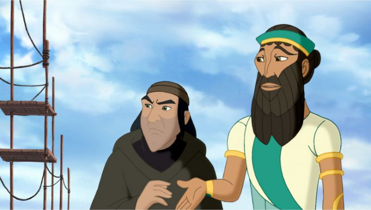 Hreel (li.) versucht am Fuße des Turms den König zu Babel von der Fertigstellung des Turms zu überzeugen.