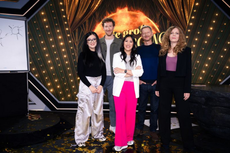 "Die große Weltuntergangsshow" - ein Wettbewerb der besonderen Art: In mehreren Spielrunden stellen sich Parshad (l.), Louis Klamroth (2.v.l.), Michael Kessler (2.v.r.) und Sarah Bosetti (r.) außergewöhnlichen Herausforderungen, bei denen Köpfchen, Teamgeist und schnelle Entscheidungen gefragt sind. Am Ende sichern sich die Sieger nicht nur den Pokal, sondern auch die Reise ins Ungewisse - Raumanzüge inklusive. Eine Show voller Spannung, Spiel und Weltuntergangsflair präsentiert von Mai Thi Nguyen-Kim (M.).