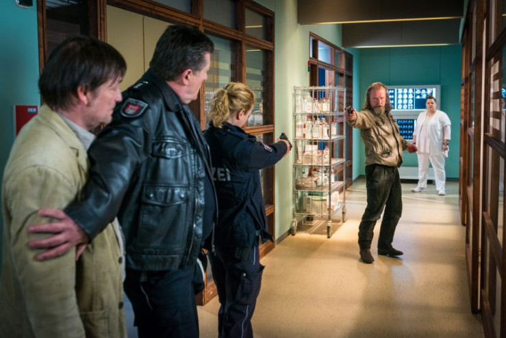 Heiner Busse (Paul Faßnacht, 2.v.r.) will sich für den Überfall auf seinen Sohn rächen und trifft im EKH auf Franzi (Rhea Harder-Vennewald, M.), Hans (Bruno F. Apitz, 2.v.l.) und Bewährungshelfer Schröter (Christian Kerepeszki, l.).