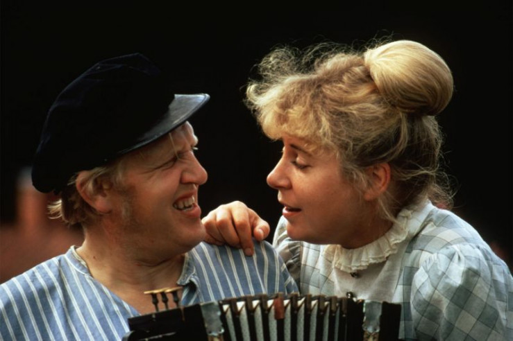 Die verliebte Lina (Maud Hansson) hört Alfred (Björn Gustafson) beim Singen und Musizieren zu.