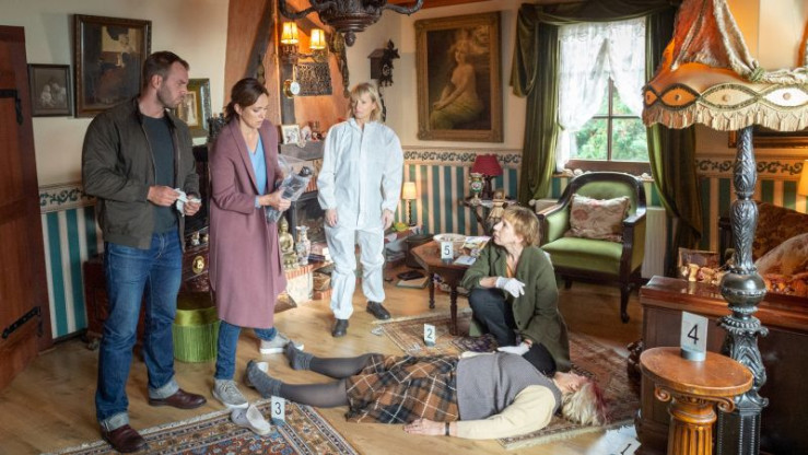 Karoline Joost (Nike Fuhrmann, 2.v.l.), Lars Pöhlmann (Dominic Boeer, l.), Roswitha Prinzler (Silke Matthias, M.) und Helene Sturbeck (Katharina Blaschke, 2.v.r.) haben einen neuen Fall zu lösen: Rentnerin Ingrid Petersen (Sonja Konrath-Schling, r.) ist in ihrem Haus erschlagen worden. Offenbar hat die Frau einen Einbrecher überrascht. Aber hat der sie auch getötet? Oder hat jemand anderes die sammelwütige Rentnerin ermordet?