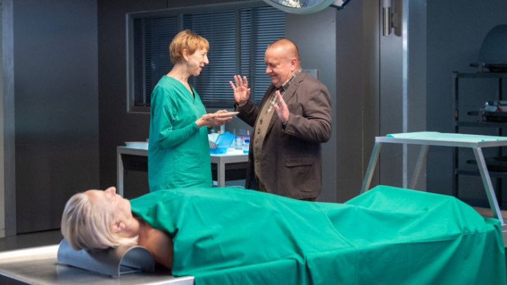 Für Hauptkommissar Jan-Hinrich Reuter (Udo Kroschwald, r.) ist es ein absolutes Rätsel, wie Rechtsmedizinerin Helene Sturbeck (Katharina Blaschke, M.) an ihrem Arbeitsort auch nur einen Bissen herunterbekommt. Doch Helene winkt ab - reine Übungssache - und versorgt den Kommissar mit Fakten zum Mord an Ingrid Petersen (Sonja Konrath-Schling, r.): Die Frau ist mit einer Bronze-Statue erschlagen worden und hat den tödlichen Angriff nicht kommen sehen. Wer hat die Rentnerin so kaltblütig ermordet?