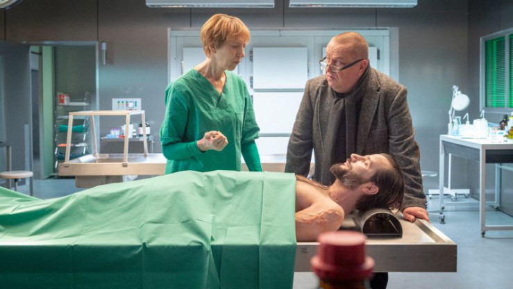 Sven Burdenski (Felix Maria Zeppenfeld, r.) hat nichtsahnend eine Leiche in seinem Wäschetransporter durch Wismar kutschiert. Er beteuert den Kommissaren gegenüber seine Unschuld. Doch Karoline Joost (Nike Fuhrmann, l.) und Lars Pöhlmann (Dominic Boeer, M.) sind skeptisch. Wie kann jemand nicht merken, dass er eine Leiche im Wagen transportiert? Ist Sven Burdenski so unschuldig, wie er tut?