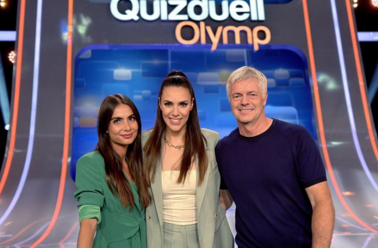 Moderatorin Esther Sedlaczek (M.) mit den Kandidaten des Teams "Sportschau": Lea Wagner (l.) und Tom Bartels (r.)