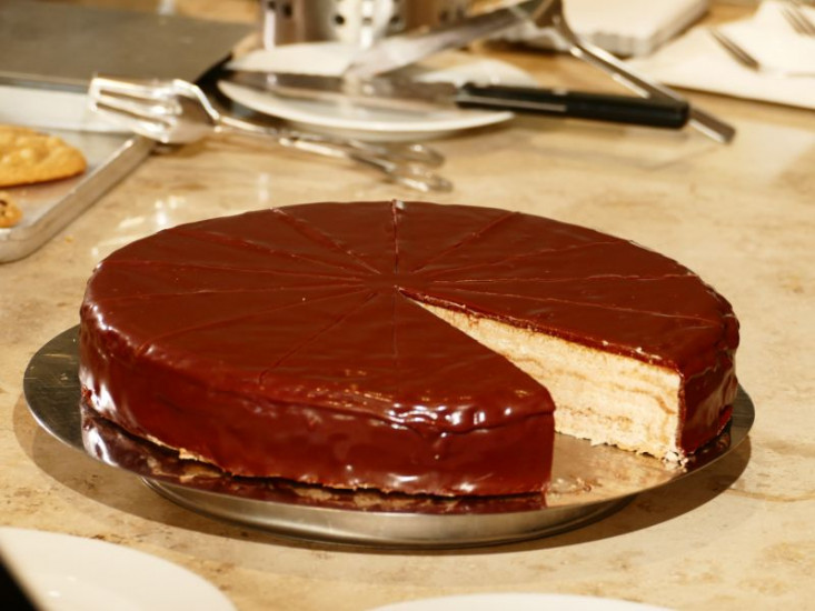 Prinzregententorte mit sieben Schichten als Symbol für die sieben bayerischen Regierungsbezirke (einst acht inklusive der Pfalz!), Konditorei Erbshäuser.