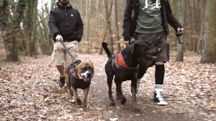 Tierisch gute Helfer: "Dodge Challenger" (rechts) und "Maja" beim Mittagsspaziergang in Schwerin. Ohne sie wären ihre Besitzer Mark und Paul nicht hier, würden sie auch keine Therapie machen. Die beiden Männer waren jahrelang drogenabhängig und sind jetzt in einer sechsmonatigen Reha in Schwerin.
