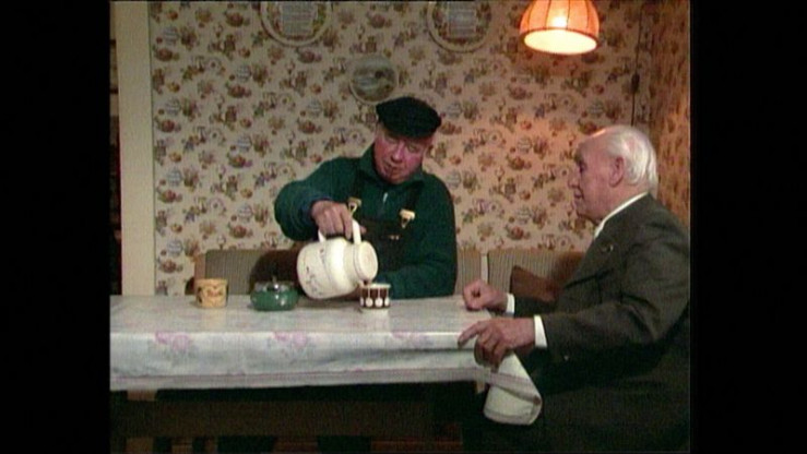 "Lebenslinien" 1992: Heiner Firnbach (rechts) ist 91 und erinnert sich an sein langes Arbeitsleben als Schiffer auf dem Main. Bei aller Mühe, sagt er, war es doch "ein geglücktes Dasein". Im Bild: Mit seinem ehemaligen Kollegen beim Kaffee.