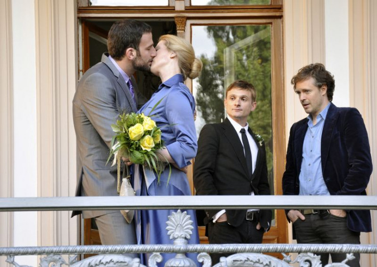 Bitter: Moritz (Florian Lukas, 2. v. re.) hat seiner Braut Ines (Diana Amft) gerade das Ja-Wort gegeben - und schon küsst sie ihren Geliebten Bernd (Matthias Weidenhöfer, li.). Rechts: Wolfi (Daniel Aichinger).
