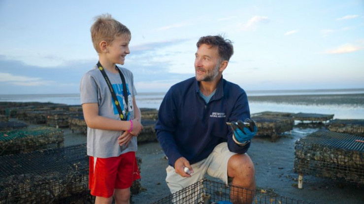 Probieren erlaubt: Der "Shellfish Officer" Ryan Burch kümmert sich um das Austern-Projekt der Naturschutzbehörde, ein Geschmackstest gehört dazu - Ryans Sohn River verzichtet gern darauf.