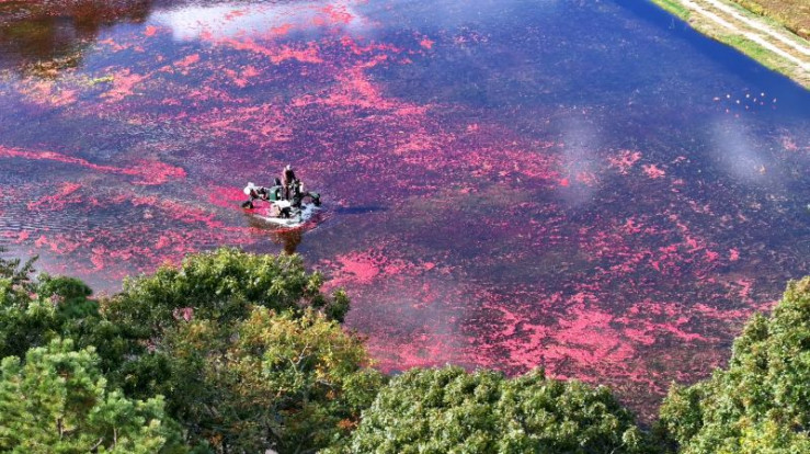Farbenfrohes Spektakel: Für die Cranberry-Ernte werden die Felder geflutet, mit Hilfe von speziellen Mähdreschern schlagen die Farmer die Beeren von den Sträuchern.