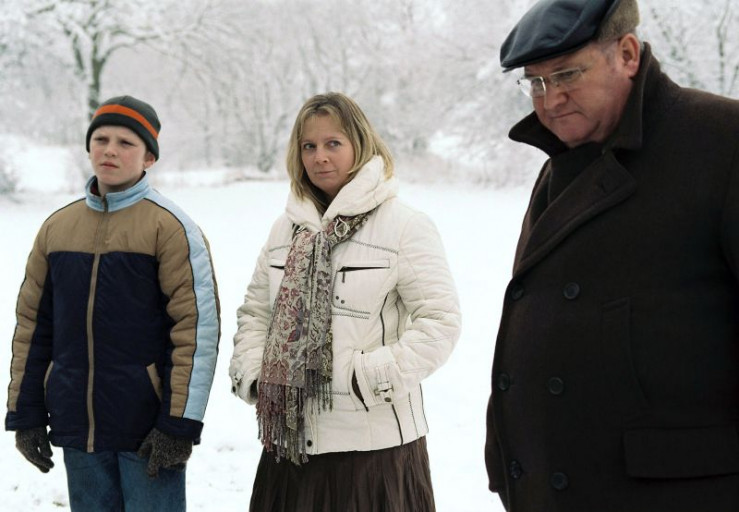 v.l.n.r.: Fabian (Enno Trebs), seine Mutter Marie Dost (Gabriela Maria Schmeide) und Krause (Horst Krause) holen einen Weihnachtsbaum aus dem Wald.