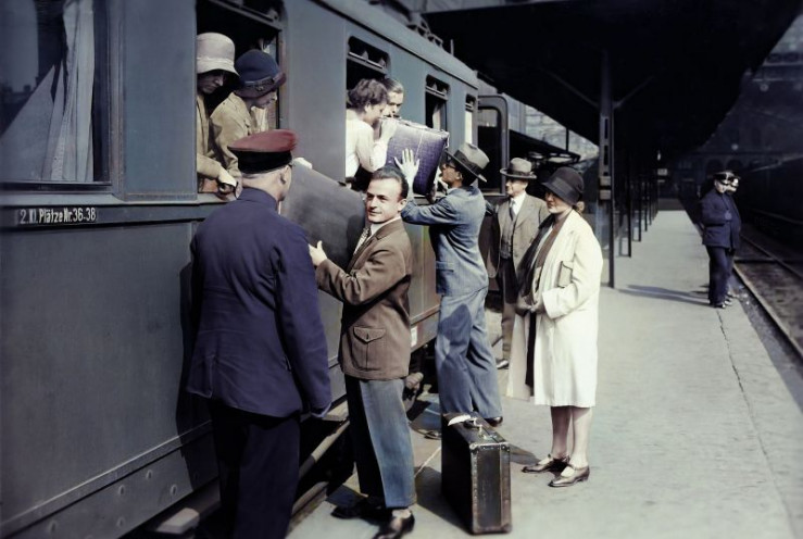 Reisende an einem Berliner Bahnhof 1928.
