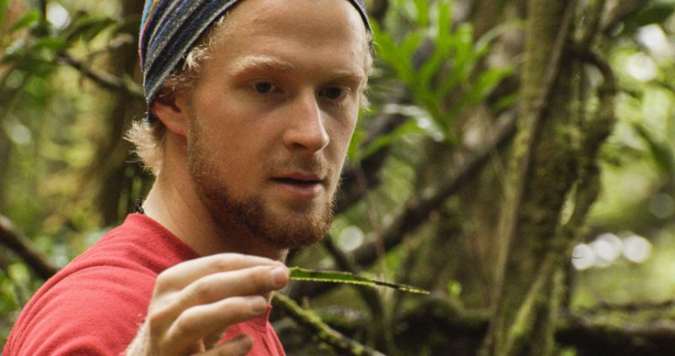 Assistent Matthew Goodman mit dem Werkzeug der Neukaledonischen Krähen, einem zurechtgeschnittenen Pandanusblatt.