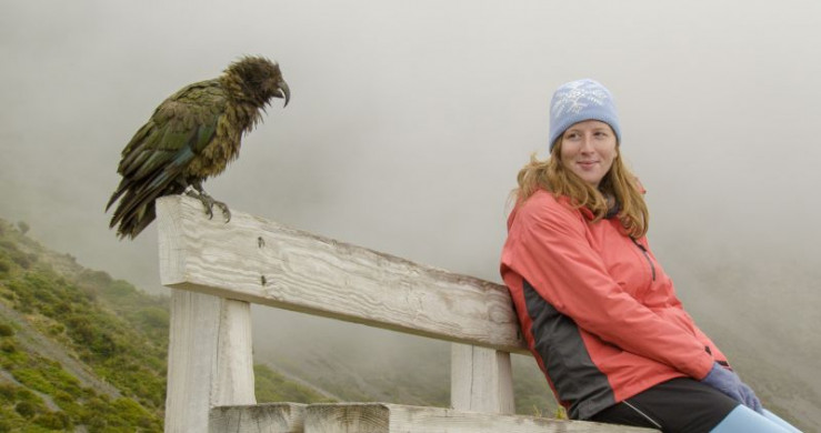 Wissenschaftlerin Amanda Greer mit ihrem "Forschungsobjekt" hoch in den Alpen Neuseelands. Da Keas Millionen Jahre auf der Insel ohne Menschen und Säuger lebten, sehen sie uns nicht als Feind an.