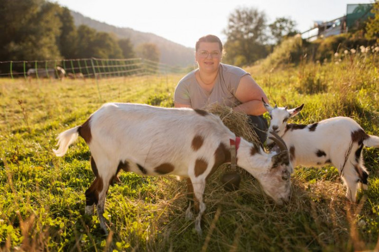 Marina Laqua mit einer Ziegenmutter und einem Zicklein auf der Weide. Weiteres Bildmaterial finden Sie unter www.br-foto.de.